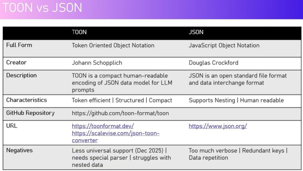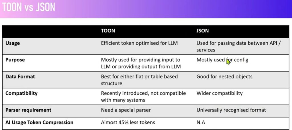 While TOON offers significant token savings and compact representation, its limited adoption and requirement for special parsers mean it currently complements JSON rather than replacing it. As AI-driven applications continue to grow, TOON may gain wider adoption, especially in scenarios where token efficiency is critical.